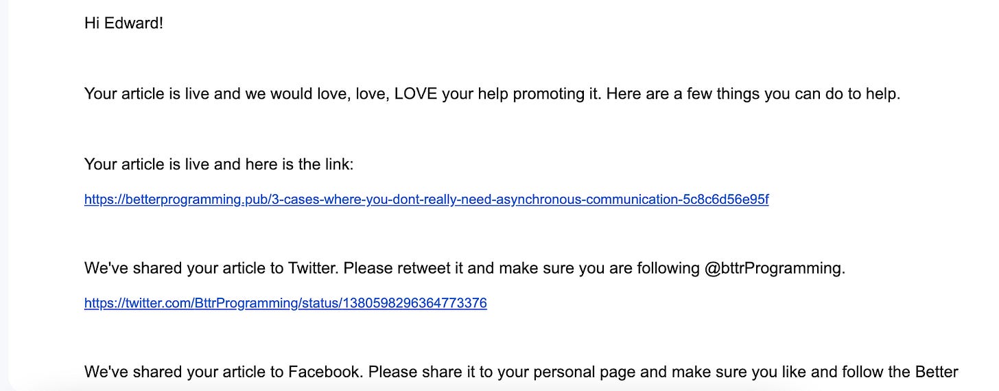 I have not created accounts on Twitter or LinkedIn, and some individuals have mentioned that I have overlooked two significant methods to acquire an audience. Nonetheless, to maintain a balance between composing newsletters and work, sharing articles on Twitter and LinkedIn necessitates modifying the content, which takes more time and energy.